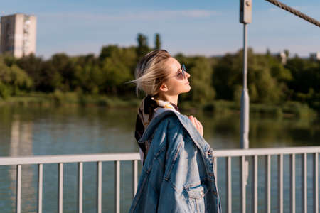 Beautiful relaxed blonde young woman wearing fashionable sunglasses, nice white shirt posing on the bridge.