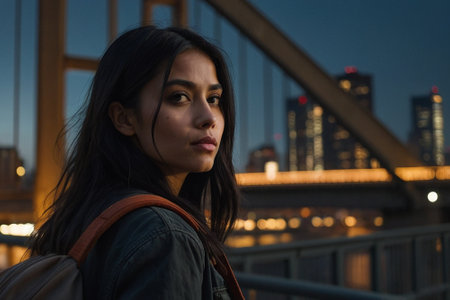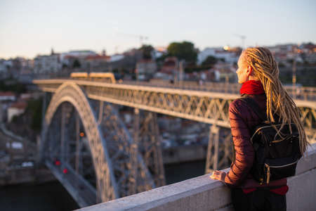 Travel urban woman enjoying the sunset over the huge bridgi while visiting the city and having a good time.