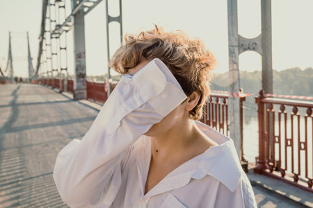 Close up woman hiding face behind shirt sleeve standing on bridge portrait picture. Closeup front view photography with blurred background. High quality photo for ads, travel blog, magazine, article