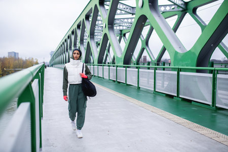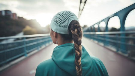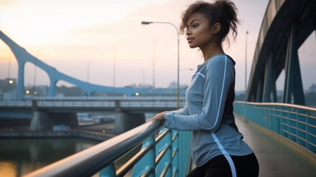 Photo of sporty woman walking towards the bridge. Generative AI