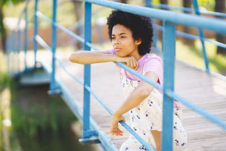 African American girl lost in thought, feeling lonely and depressed, thinking about personal or relationship problems.