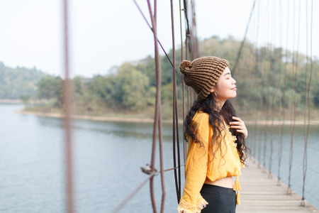 beauty asian woman in yellow wear and black jeans and wool hat on the wooden bridge
