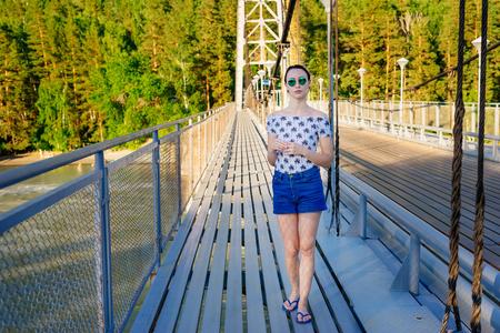 The girl walks on the bridge over the river. Evening summer walk