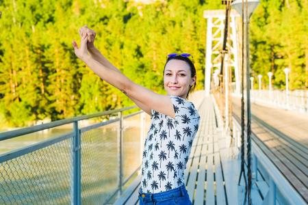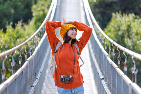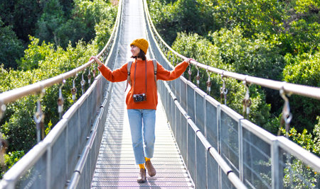 Travel and photography. A young woman with a camera and a backpack walks along a suspension bridge. Happy female tourist traveler enjoying her trip. Girl with a camera.