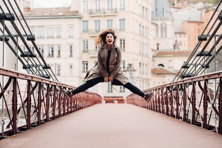 a girl in a coat with her hair down jumps emotionally on a bridge in the old city of Lyon. France. Girl in a coat in France