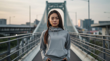 A teenage girl in a hoodie, contemplatively looking into the distance, sitting on a bridge