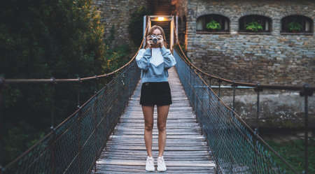 blonde tourist girl with glasses stands on suspension bridge of old historical city and takes photo with retro camera, cute young hipster enjoying a weekend vacation in summer uses photocamera to take picture of her journey