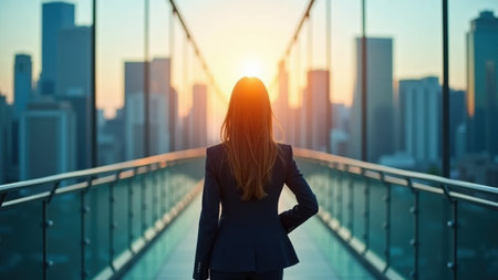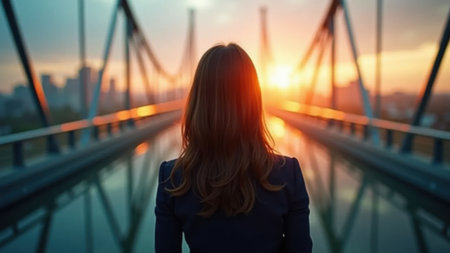 Silhouette of a Businesswoman Crossing the Bridge at Sunrise and Sunset. Generative ai. High quality illustration
