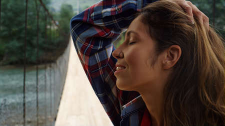 Beautiful woman touch hair on nature river bridge. Traveler hiking in mountains landscape. Portrait of tourist girl relaxing on summer vacation. Happy girl face posing camera outdoors. Leisure concept