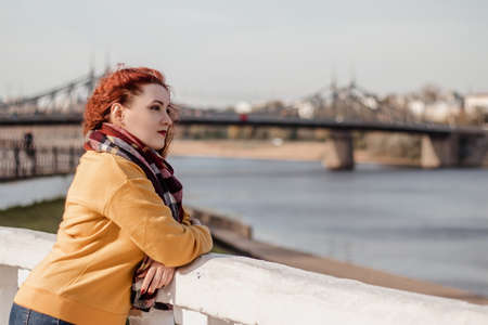 Young red-haired woman walks along waterfront in autumn sunny day and enjoy view. Lady looks into the distance.