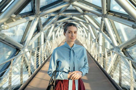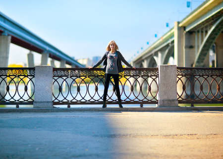 Beautiful woman leans on the railing of the bridge in the background