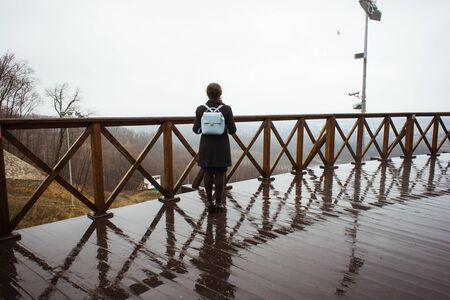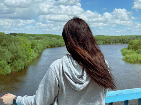 A dark haired Ñaucasian girl stands with her back in a light gray jacket and looks towards the river and the forest in the city of Chernigov in Ukraine.