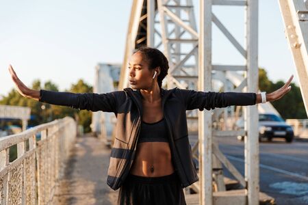 Photo of african american brunette woman in sportswear using earpods and doing exercises while working out on old bridge