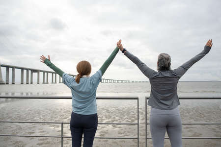 Back view of senior friends after training. Female friends on embankment, rising hands, celebrating. Sport, hobby, friendship concept