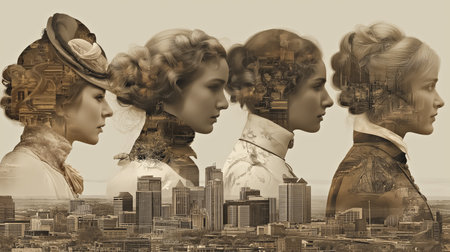 Overlapping profiles of women in vintage attire with city skyline. Fashion history, heritage