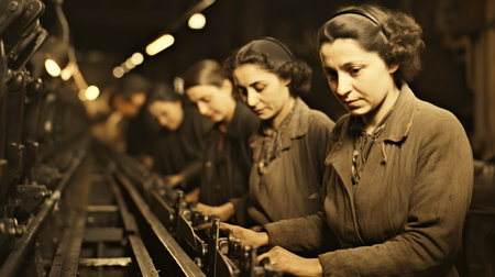 A black and white photograph of a group of women in a sewing factory each operating a seamstress machine