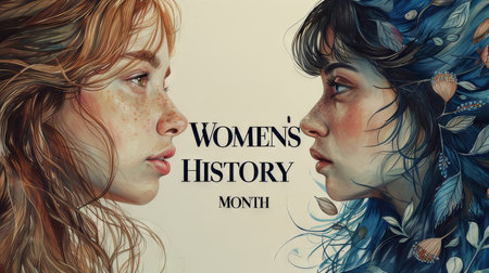 A stunning digital illustration of two women, designed to honor Women's History Month, featuring intricate floral and feather details.
