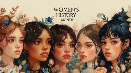 Illustrative banner depicting young women with diverse appearances united for Women's History Month, surrounded by intricate floral designs, symbolizing beauty and diversity.