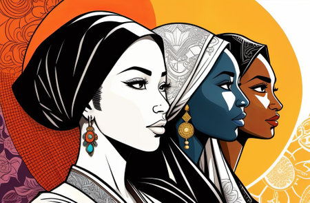 An artistic representation of many women, different colors of the skin, religion and style side by side in profile views. Flat style illustration by Generative AI.