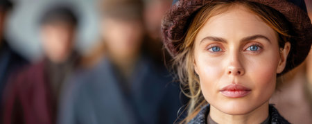Portrait of a beautiful woman in a hat on the background of her friends