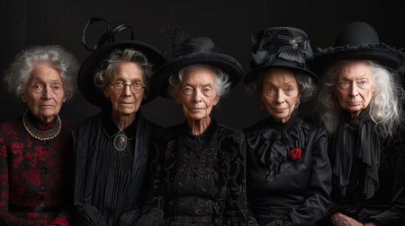 A group of women wearing black hats and dresses with their faces painted, AI