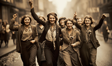 A vibrant reenactment of the Women's Suffrage movement captures the spirit of the fight for women's rights Participants dressed in period clothing march and hold banners, commemorating the historical struggle for equality and celebrating the hard-won victory of the vote This powerful image evokes the courage and determination of the suffragists who paved the way for women's empowerment AI Generative