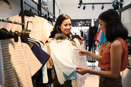Shop assistant helping young woman to find blouse of her size in the store