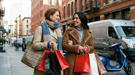 Two stylish women in winter coats and scarves walk and talk on a city street, carrying shopping bags after a successful day of retail therapy.