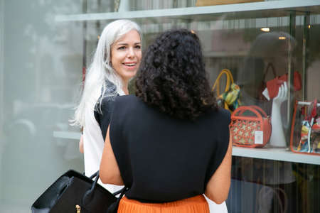 Happy female friends standing at shop window with accessories and chatting. Back view. Window shopping concept