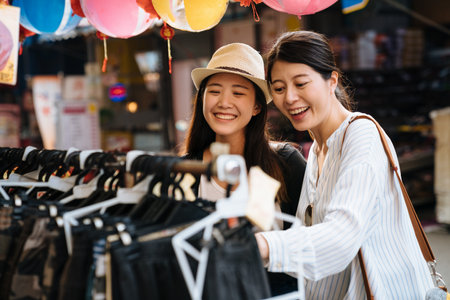two asian japanese young women friends buying clothes in local market in taiwan taipei. smiling girls sisters having fun choosing products on cloth rack outdoors vendor. female travelers laughing.