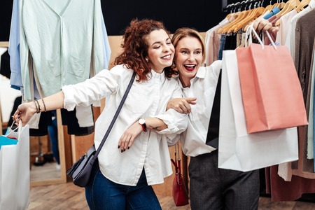 Bags of clothes. Cheerful mother and daughter smiling while leaving shop with bags of new clothes