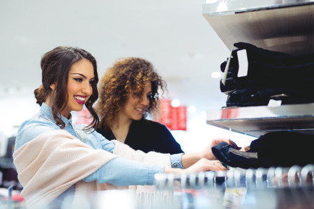 Two girls customer chooses jeans in store, and buyer carefully examines product.