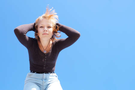 teenage girl with golden hair looking at the camera against the background of the sky, bottom view.