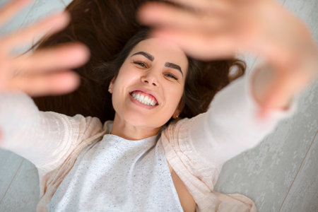Portrait from above of happy young positive woman lying on rustic wooden floor raising both hands up, looking into camera with broad beaming smile showing her white straight healthy teeth