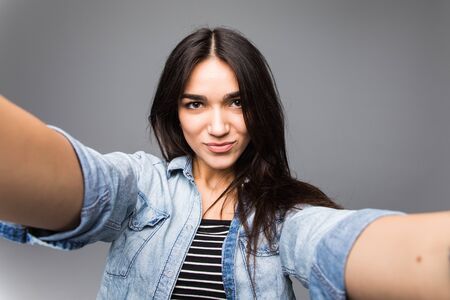Close-up of young beautiful woman taking selfie. Isolated white background