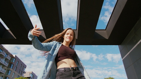 A young girl performs modern hip hop dance on the streets of the city during the summer, twisting and rotating.