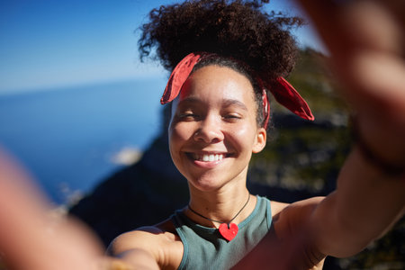 Young smiling woman taking travel selfie on trekking excursion day - Hipster guy self photo at view point with blue ocean background - Concept of healthy lifestyle in beauty of nature.