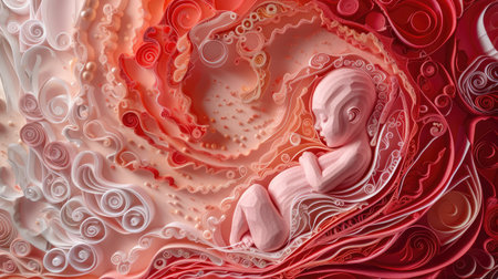 Vivid depiction of a human fetus in a red, fluidic space, with bubble-like structures around