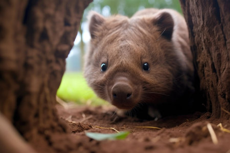 close-up of a wombat peeking out of its burrow entrance, created with generative ai