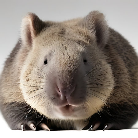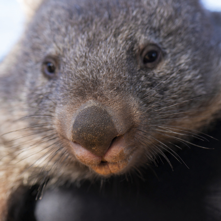 A close-up of a cute wombat with coarse fur and expressive eyes, framed by a soft blurred background.