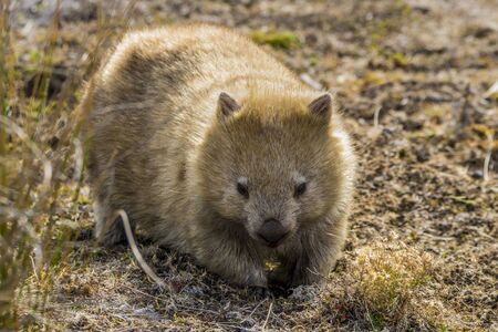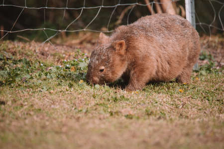 MARIA ISLAND, TASMANIA, AUSTRALIA- MARCH 2019: Wombat (Vombatus ursinus) grazing in the Australian bush.