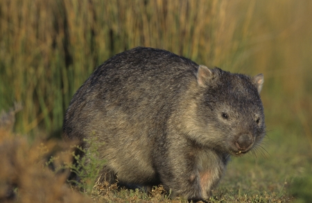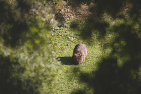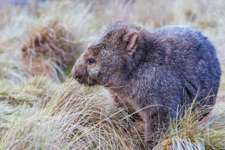 Large adorable wombat during the day looking for grass to eat in Cradle Mountain, Tasmania