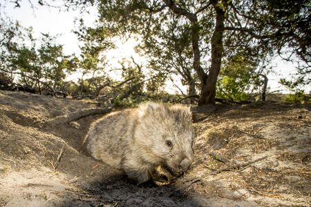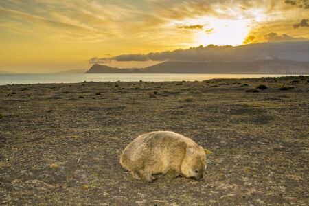 MARIA ISLAND, TASMANIA, AUSTRALIA- MARCH 2019: Wombat (Vombatus ursinus) on Maria island during sunset over Tasmanian sea