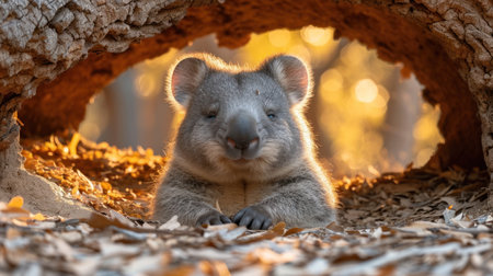 AI Generated. Serene Wombat Relaxing in Burrow Entrance Bathed in Soft Sunlight - Cozy Wildlife Scene