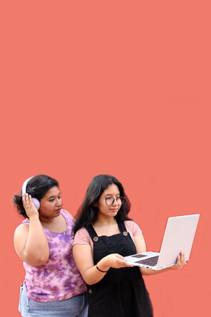 Collaborating two women in sleeveless tops, operating laptop on sofa in lounge with AI overlay. Teamwork, collaboration, notebook, device, livingroom, workspace, digital