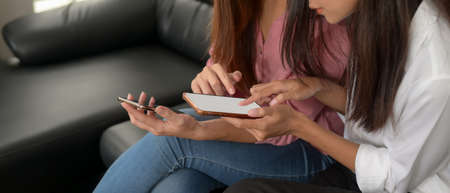 Businesswomen partners looking at tablet computer and smart phone, Business discussion.