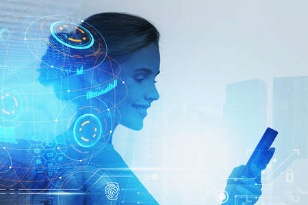 Businesswoman using phone, work in modern office on new project. Double exposure. Concept of success. Social network hologram.