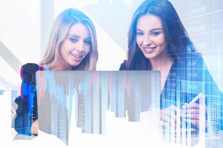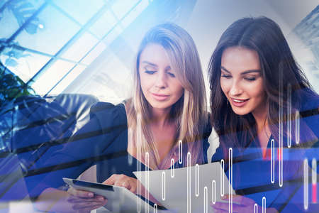 Young attractive businesswomen wearing formal suit work together discussing new profitable contract. Office workplace with financial chart and bar diagram. Concept of teamwork, co-working, partnership