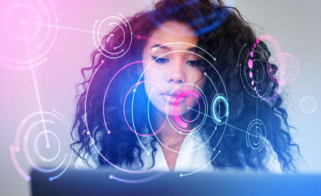 Black businesswoman portrait using laptop, double exposure, metaverse hologram with colorful circuit of web connection. Concept of online network