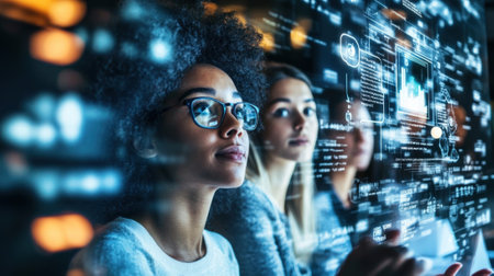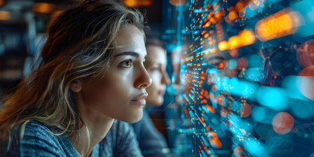Double exposure of two women with abstract digital circuits. AI and futuristic concept